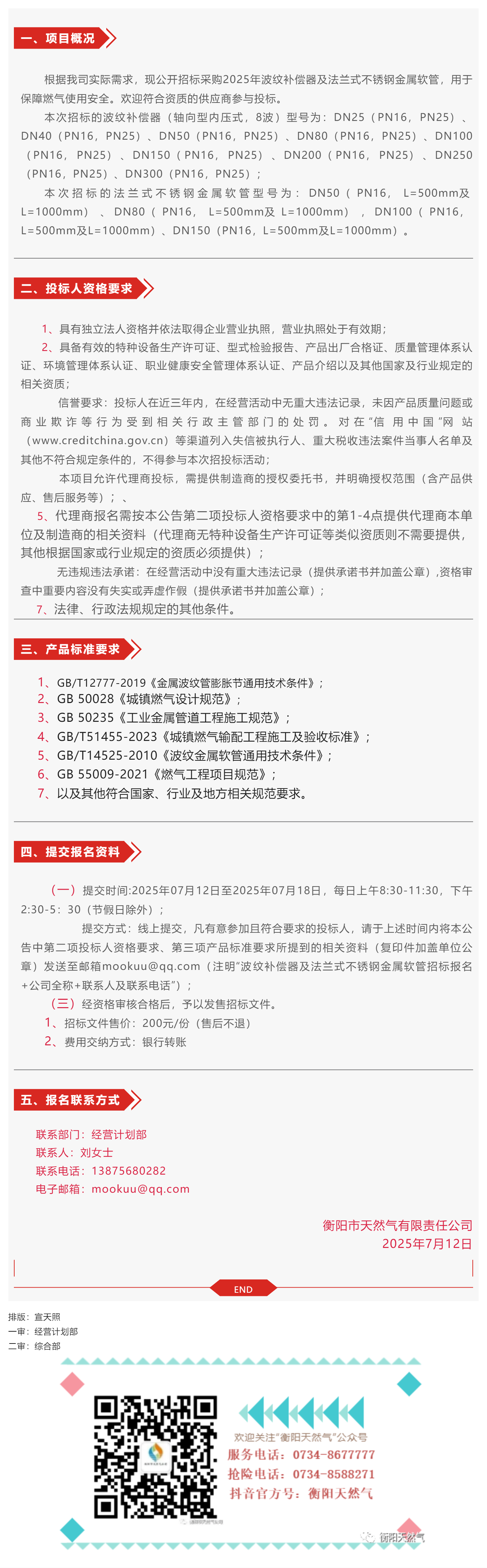 招標公告丨衡陽(yáng)市天然氣有限責任公司2025年波紋補償器及法蘭式不銹鋼金屬軟管采購招標公告