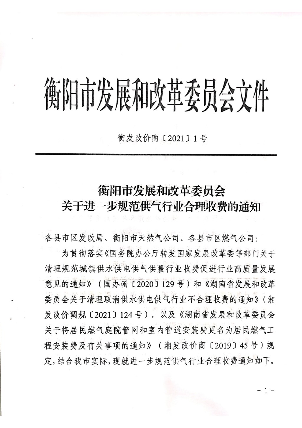 衡發(fā)改價(jià)商【2021】1號關(guān)于轉發(fā)《衡陽(yáng)市發(fā)展和改革委員會(huì )關(guān)于進(jìn)一步規范供氣行業(yè)合理收費的通知》的通知